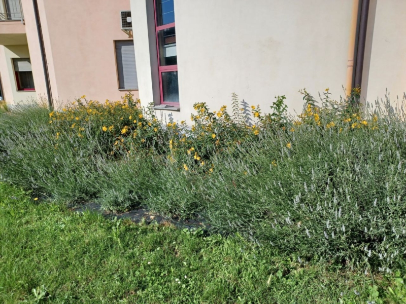 Nel frattempo prende colore e forza l'aiuola della lavanda e dell'iperico: la lavanda, dopo la sostituzione delle piante ammalorate, si avvia ad una fioritura molto bella e profumata. L'iperico sta offrendo un bellissimo risultato dopo la potatura invernale fatta da Marcello e Federico.